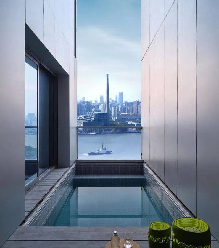 约252㎡中间套则在13.2米瞰江面基础上,奇数层开创性地增加了约6米的进深采光面,利用中间套的双层挑高,打造上海滨江首个空中泳池户型。