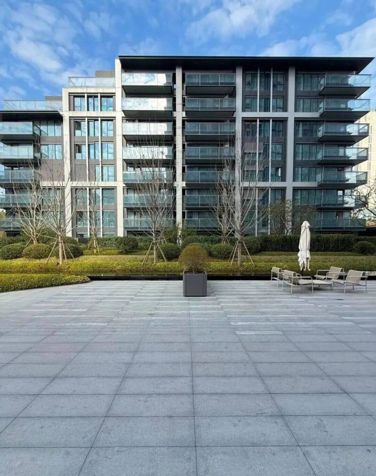 在入口、下沉式庭院等,你能看到大面积黑色花岗岩中的“爱马仕”山西黑和意大利进口的蓝金砂大理石,这些品种存量稀少,且项目多为整石运用,价格昂贵。