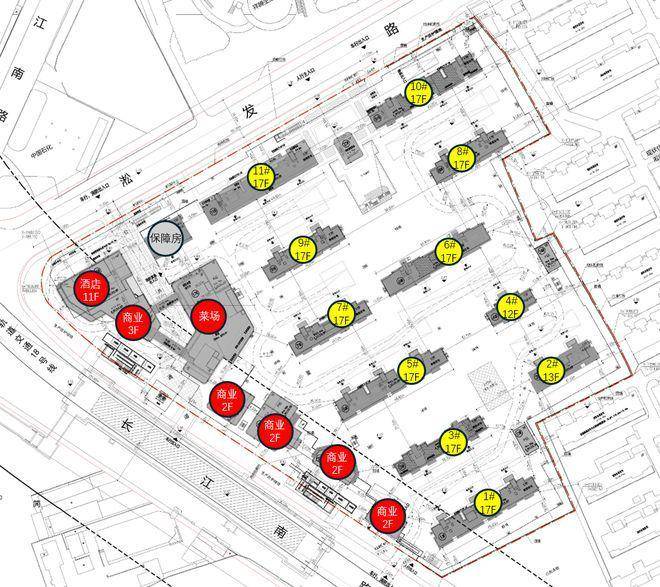 ,总户数876户,可售住宅约807套;另需建设1栋保障性住宅房,靠近长江南路一侧规划有酒店、商业、菜场、社区食堂等业态。地块中小套比例不低于50%,装修标准(集采价)不低于3000元/㎡。