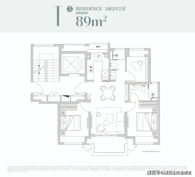 厨房、餐客厅、阳台形成直线通风廊道,南向三开间+宽尺客餐厅,轻松容纳二胎三代家庭的日常;
