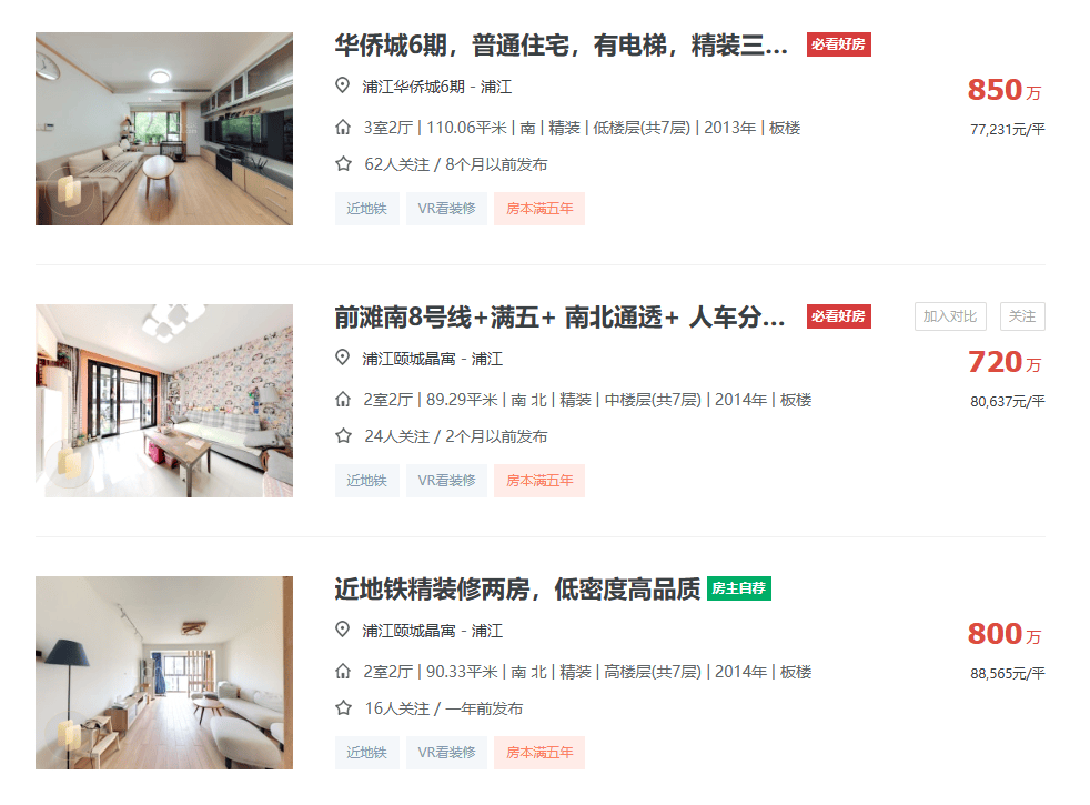 特别是浦江华侨城、浦江颐城晶寓、浦江颐城尚院这一批房龄较新的,挂牌价格大多稳定在8万/㎡左右。
