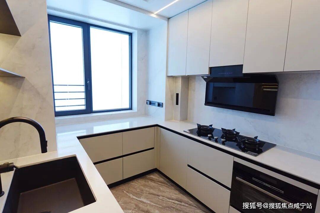厨房部分,大得不像是107㎡该有尺寸,据说窗口下方位置是飘窗,借一部分空间,因此整体操作空间大大增加,喜欢用小家电的业主,也有更多布置空间了。