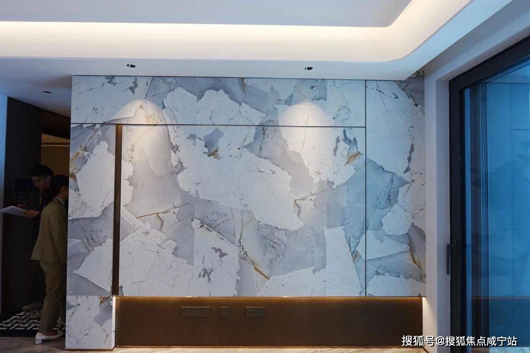 另一个样板间则是170㎡的,这个户型是电梯双开门的类一梯一户。开门以后映入眼帘的是陶瓷的编织纹玄关背景墙。