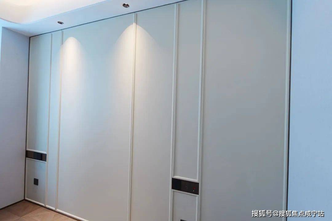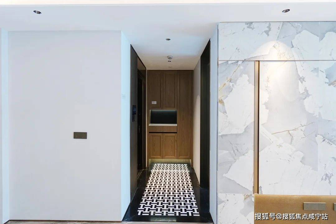 北次卧旁即是次卫,次卫干湿三分离设计,相当人性化;南次卧联通在另一侧,更适合老人居住。安高这次打造的交付样板间,是从电梯厅开始的。107㎡是一梯两户,电梯间区域,主要以不锈钢条作为通高区域的墙面划分,吊顶带金属弧线。入户门前,金属面板搭配编织纹,从上方打下来的暖色调灯光,映照在项目logo和室号之上,让业主从电梯里出来走到家门的时候就已经给满了仪式感。