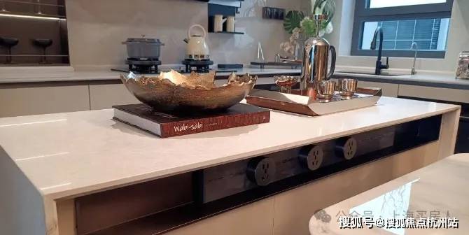 厨房额外标配带有收纳柜体的岛台空间,轨道式插座同样是交付标准,厨房台面是和内环某10万+项目同款材料: